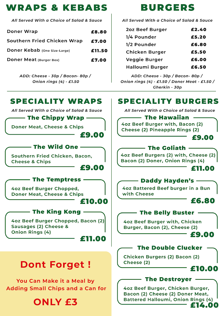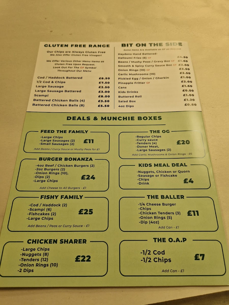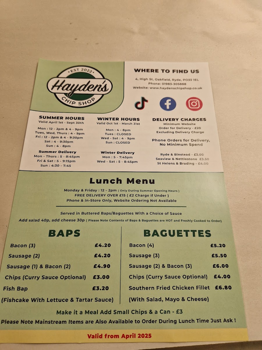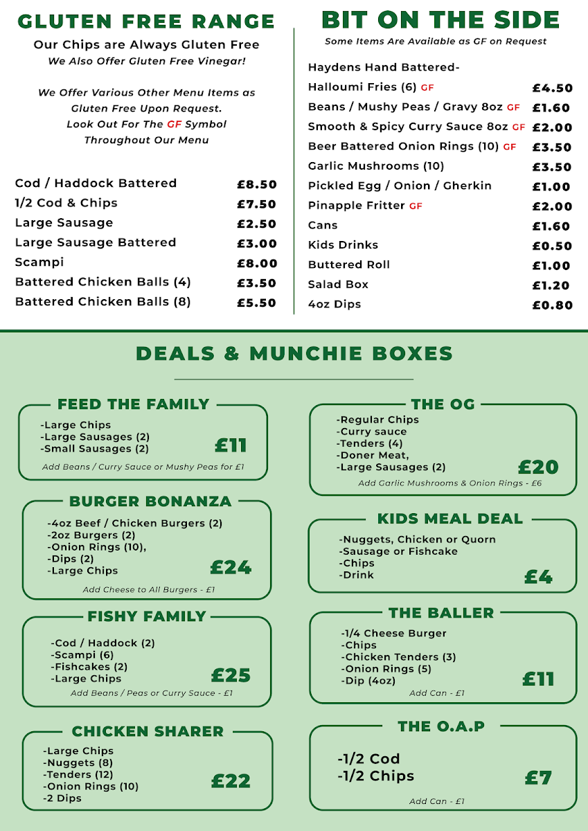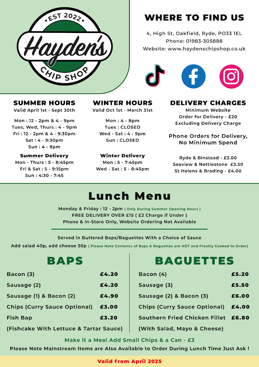 Hayden's Chip Shop, located at 4 High St, Oakfield, Ryde PO33 1EL, United Kingdom, is a standout destination for anyone craving traditional fish and chips. With a reputation for serving up some of the best in the area, the menu offers a classic selection of British favorites, all prepared with fresh, high-quality ingredients.